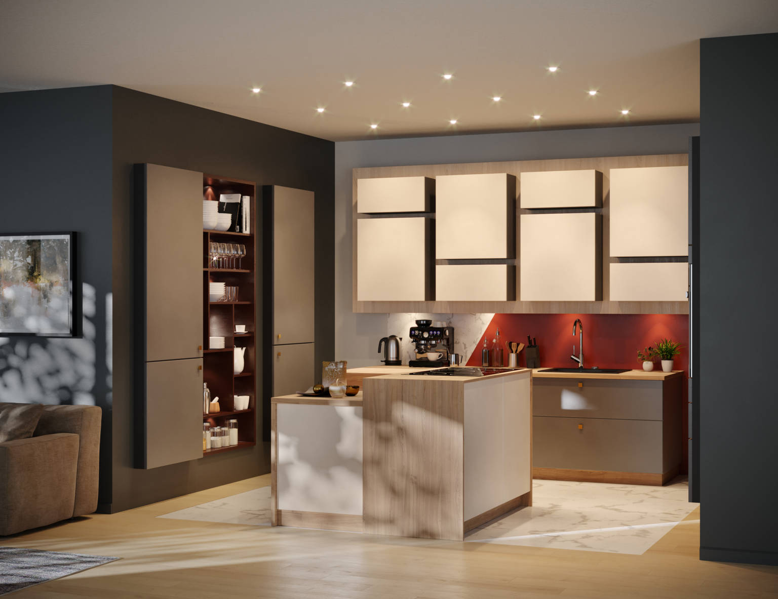 modèle IRIS en coloris écru et poivre ; avec le bouton doré et des plans de travail en aulus chêne naturel un beau mélange pour une ligne actuelle. téléchargez la …